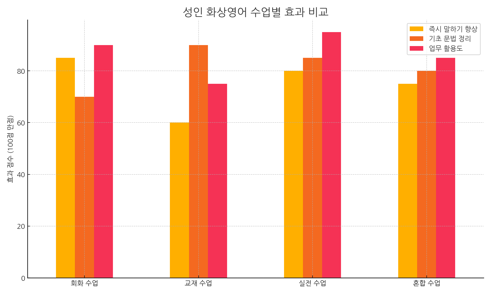아래 그래프는 성인 화상영어 수업 4가지 유형별로 어떤 영역에서 가장 효과적인지를 시각적으로 비교한 자료입니다. 본인의 학습 목적에 따라 어떤 수업이 더 적합한지 판단할 때 참고하시면 좋아요.
