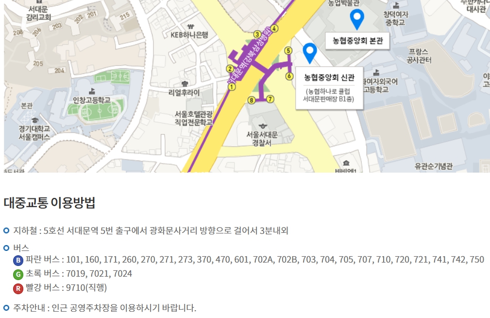 - 택시를 이용할 경우 “서대문경찰서 앞”에서 하차하면 농협은행 본점 신관까지 도보 2~3분 거리로, 신분 노출 없이 방문할 수 있습니다.