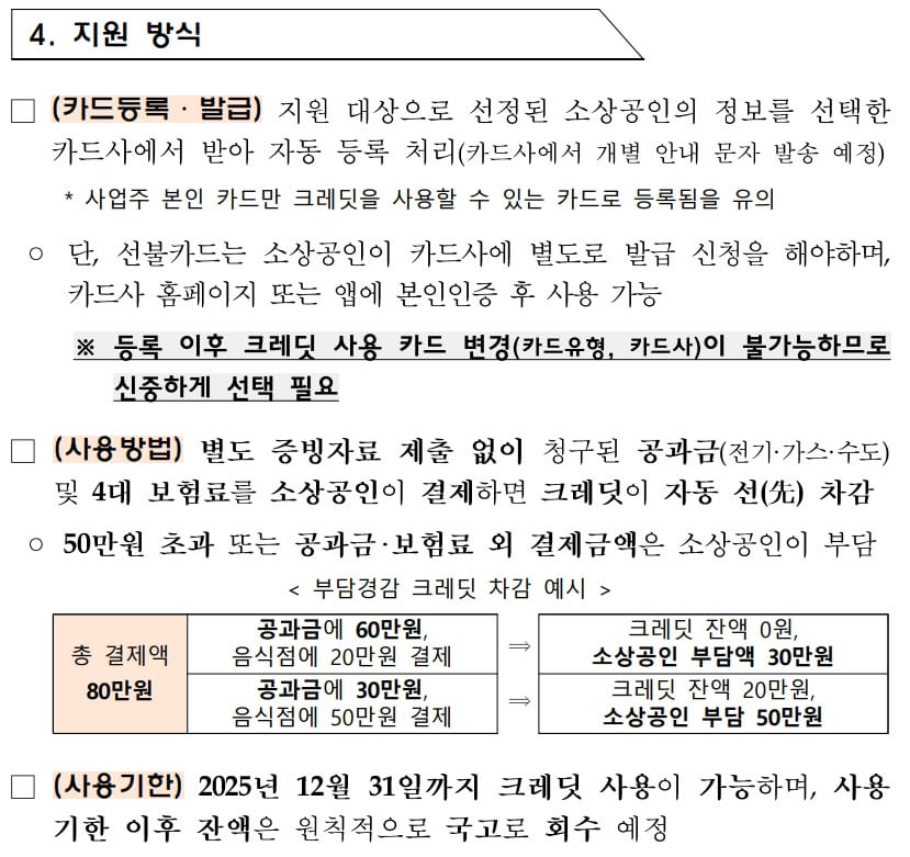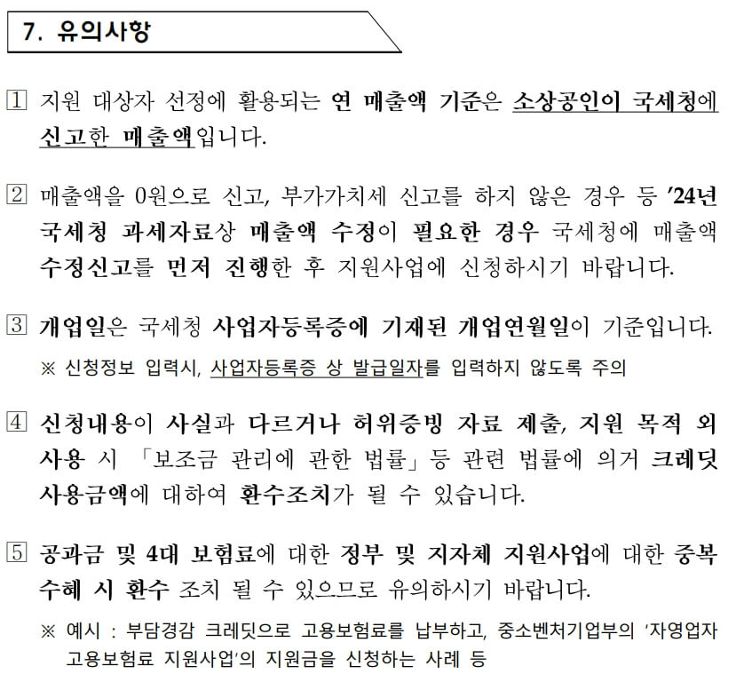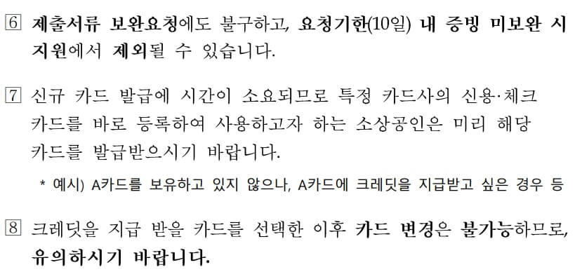 - 동일 대표가 여러 사업체를 운영해도 1개만 신청할 수 있으며, 크레딧은 현금화·양도 불가, 카드사 선택 후 변경이 불가합니다. 중복 수혜 시 지원금 환수될 수 있습니다.