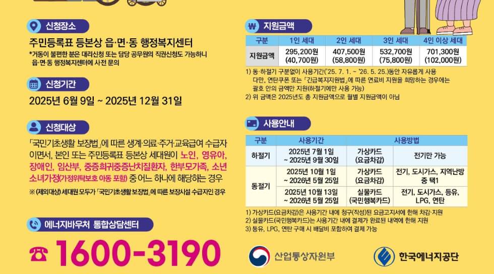 - 1인 세대 29만 5,200원부터 4인 이상 세대 70만 1,300원까지 세대원 수에 따라 차등 지급되며, 동·하절기 구분 없이 2025년 7월 1일부터 2026년 5월 25일까지 자유롭게 사용할 수 있습니다.