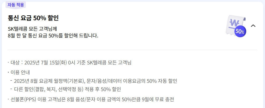 7월 15일 0시 기준 SK텔레콤과 SKT망 알뜰폰 고객(약 2,400만 명)은 8월 통신비 50% 할인을 별도 신청 없이 받게 됩니다. 월정액, 음성, 문자, 데이터 등 전체 사용 요금의 절반이 자동 할인됩니다. 9월 청구서, T월드 등 요금명세서에서 확인 가능하고, 별도로 따로 신청하거나 대리점 방문할 필요 없이 8월 실사용 요금 기준으로 자동 처리됩니다.