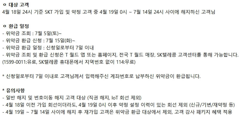 - 4월 19일~7월 14일까지 해지한 약정고객은 환급 신청만 하면 기존에 낸 위약금을 돌려받을 수 있습니다.