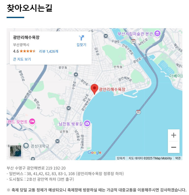 축제 당일에는 광안대교와 인근 도로가 전면 통제되므로, 지하철 2호선 광안역, 금련산역 하차 후 도보 이동을 추천합니다.
