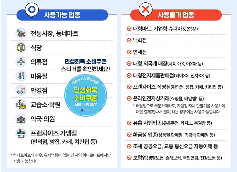 - 주소지 관할 내 자영업 주유소, 동네마트, 슈퍼, 병원 등에서만 결제