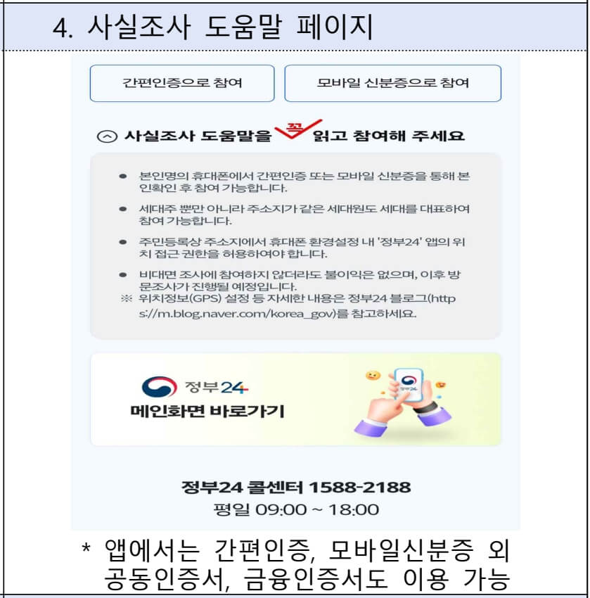 - 정부24 앱에서 비대면으로 간편하게 참여 가능합니다. 비대면 참여가 어려운 경우 방문조사가 이뤄지며 신분증 확인 후, 안내에 따라 사실조사에 참여하시면 됩니다.