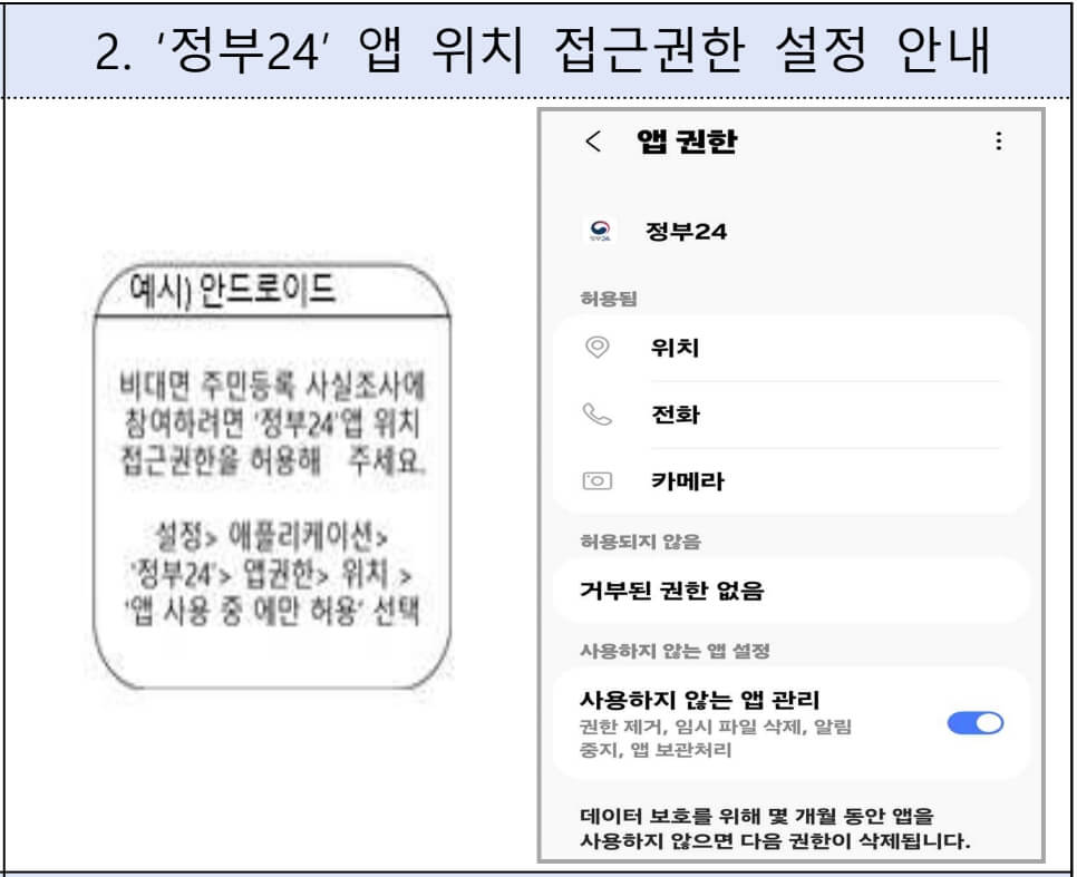 - 네, 정부24 앱에서 주소지 확인을 위해 위치정보 권한 허용이 필수입니다. 지하 또는 실내에서 GPS 수신이 어려운 경우 실외에서 참여하시면 정확도가 높아집니다.