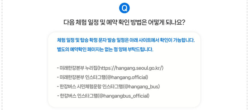 운항 일정 및 노선, 접수 방식 등은 날씨 등 현장 상황에 따라 변동될 수 있으니 반드시 위에 한강버스 인스타그램을 확인하세요. 기타 다른 확인 페이지는 아래를 참고하세요.