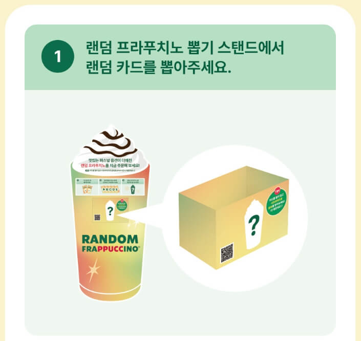 랜덤 프라푸치노는 매장 방문 시 직접 카드 뽑기로만 주문 가능합니다. 앱·웹 주문, 커스텀 변경은 적용되지 않아요.
