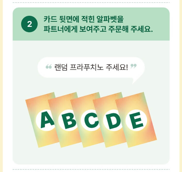 이벤트 참여 방법은, 매장 내 비치된 랜덤 카드로 음료가 정해지기 때문에 평소 선택지와는 완전히 다릅니다. 카드 겉에는 알파벳만 써있어서 직접 펼치기 전까지 음료가 뭔지 알 수 없고, 톨 사이즈 한정으로 랜덤으로 정해져요. 메뉴 또는 퍼스널 옵션 변경(휘핑 포함)이 불가, 지정된 레시피로만 제공됩니다.